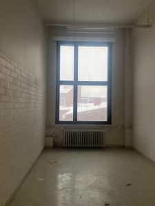 Työhuoneen ikkunat ovat sisäpihalle luoteeseen. Huonekorkeus kattovalaisinten välissä on noin 3,95 m. Huoneen mitat: pituus noin 4,85 m ja leveys 2,8 m. Työhuoneessa on vesipiste. Yhteiskäyttöinen WC on käytävällä. Kerroksessa on hissi.