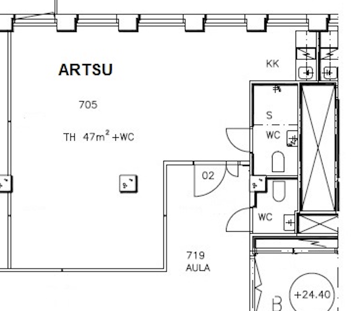 Työhuoneen ikkunat ovat sisäpihalle luoteeseen. Huonekorkeus kattovalaisinten välissä on noin 3,95 m. Huoneen mitat: pituus noin 4,85 m ja leveys 2,8 m. Työhuoneessa on vesipiste. Yhteiskäyttöinen WC on käytävällä. Kerroksessa on hissi.